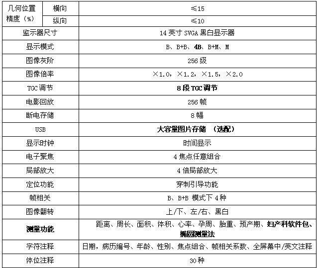 測量與計算功能:距離、面積、周長、心率、孕周(根據(jù)GS/CR/BPD/HC/FML/AD);胎重(根據(jù)AC)及預產(chǎn)期程序,光標移動采用光電軌跡球控制;