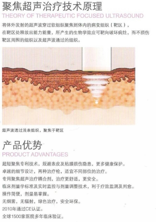 超聲治療作為一種無創(chuàng)治療(或稱為非侵入治療)的新技術(shù),在不需手術(shù)切開(切除)或破壞表面組織(皮膚、粘膜或上皮組織)以及沒有通過穿刺的前提下,對表面組織深面的組織進(jìn)行治療。它可將體外發(fā)射的超聲波透過表面組織,在表面組織深面的組織內(nèi)聚焦,產(chǎn)生一個(gè)高能區(qū)域,在短時(shí)間內(nèi)使病變組織吸收能量而快速升溫,并產(chǎn)生生化反應(yīng),最終使病變組織損傷變性,促進(jìn)組織重建和微循環(huán)改善而使病變組織得以康復(fù)。超聲波所產(chǎn)生的空化效應(yīng)可使細(xì)胞膜失去連續(xù)性或使其通透性發(fā)生變化,由于病變或增殖旺盛的組織對超聲更敏感,故在一特定范圍內(nèi)的低能量超聲可以選擇性損傷病變組織細(xì)胞而達(dá)到治療目的。
