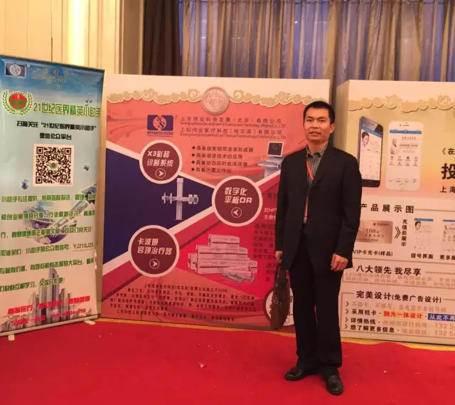 東北區(qū)銷售經(jīng)理張婷女士手拿公司資料手冊與公司主打產(chǎn)品卡波姆宮頸治療器在展板前合影