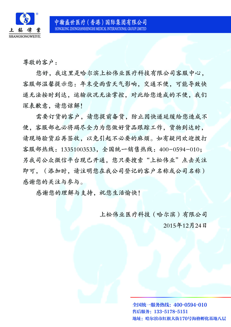 哈爾濱上松偉業(yè)醫(yī)療科技有限公司 傳真:0451-82280266 地址:黑龍江省哈爾濱市南崗區(qū)紅旗大街170號(hào)海格孵化基地8層