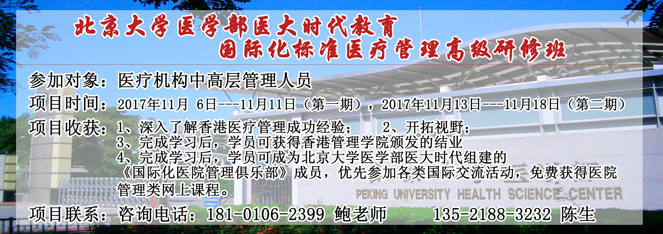 5、完成學(xué)習(xí)后,學(xué)員可成為北京大學(xué)醫(yī)學(xué)部醫(yī)大時(shí)代組建的《國(guó)際化醫(yī)院管理俱樂(lè)部》成員,優(yōu)先參加各類國(guó)際交流活動(dòng),免費(fèi)獲得醫(yī)院管理類網(wǎng)上課程。
