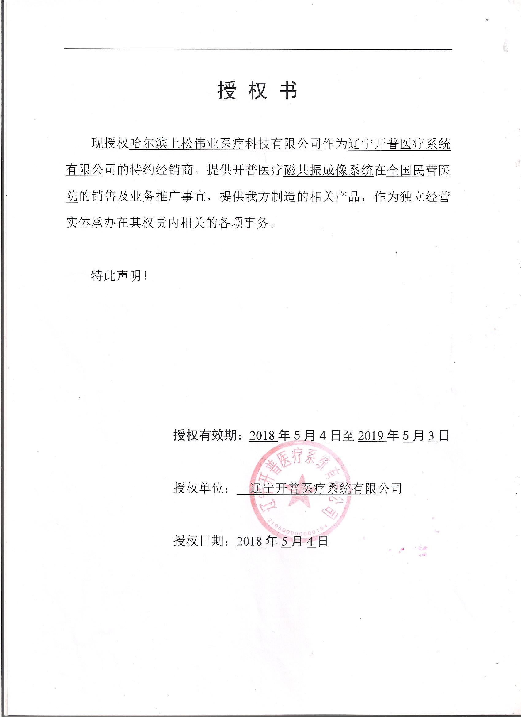 遼寧開(kāi)普醫(yī)療系統(tǒng)有限公司授權(quán)書(shū)