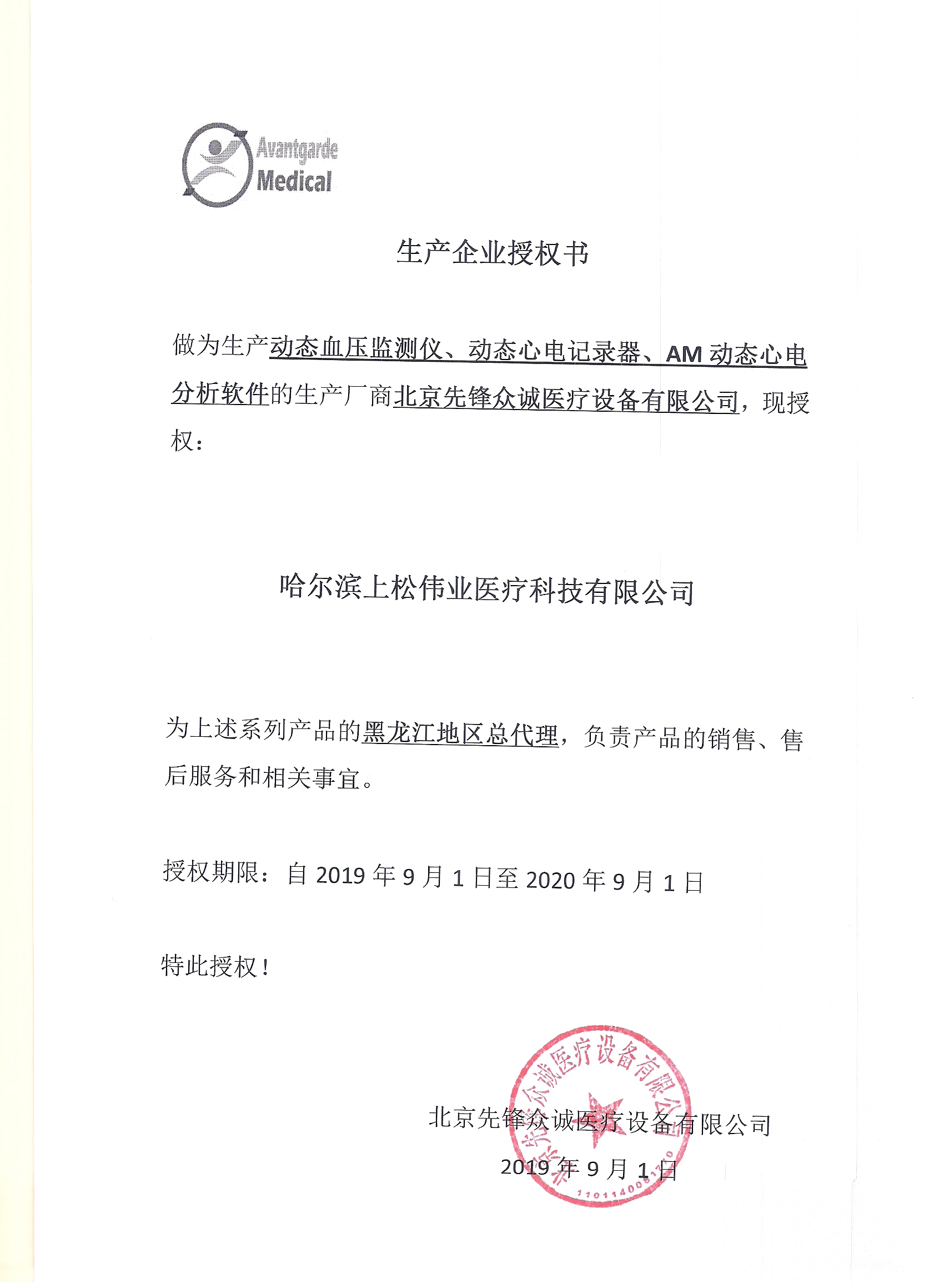 北京先鋒眾誠醫(yī)療設(shè)備有限公司授權(quán)