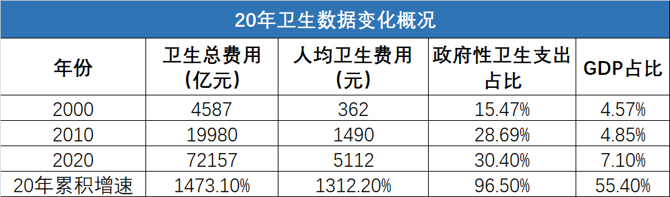 從2000年到2020年期間,我國衛(wèi)生總費用和人均衛(wèi)生費用的累積增速,接近15倍,?增速是嚇人的?。GDP的占比也從4.57%到了7.1%,提高超過50%。