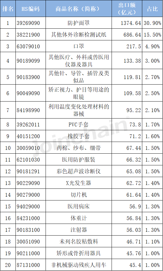 表1 2022年1-11月中國醫(yī)療器械重點商品出口額排名(TOP20)