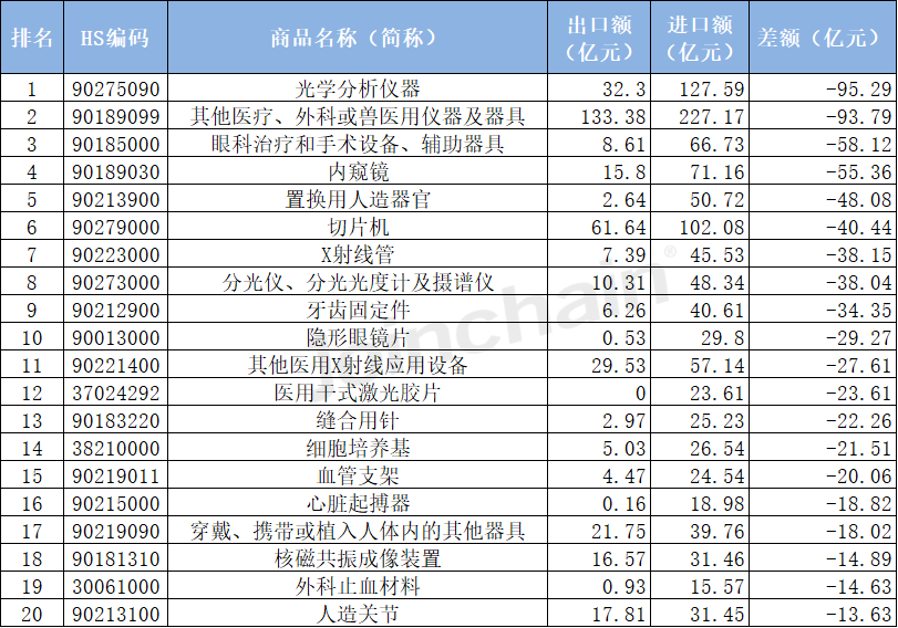 在醫(yī)療設(shè)備中,出口額較高的有彩超65.08億元,X光發(fā)生器62.72億元,切片機61.64億元,醫(yī)用病床56.90億元。